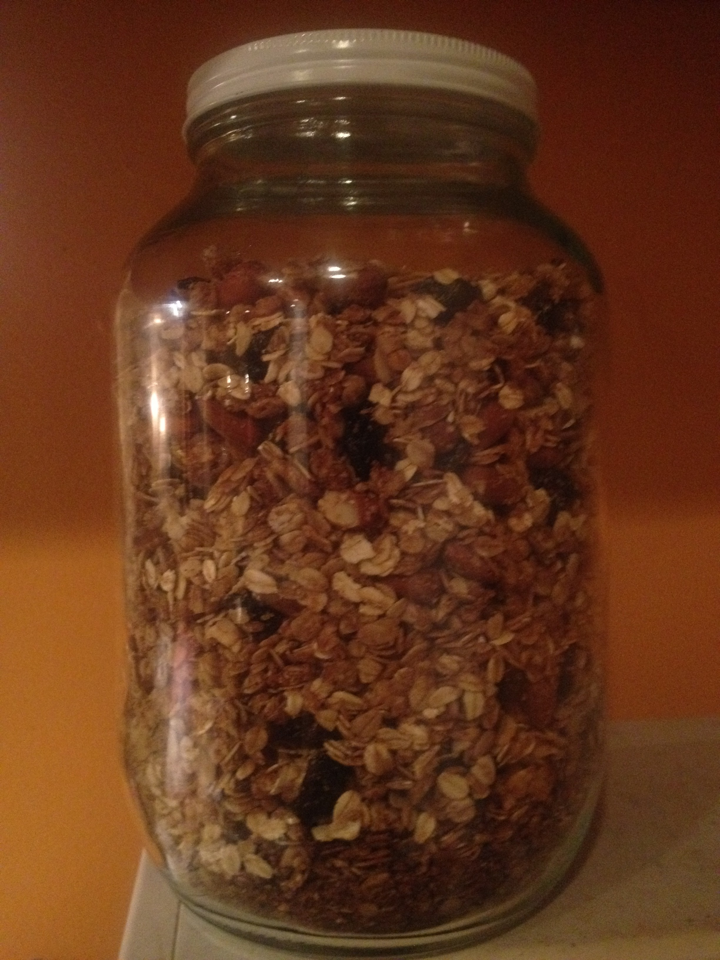 The Cherry Almond Granola is a riff on my usual granola recipe from Deborah Madison’s Vegetarian Cooking for Everyone. Mix 6 c. oats, 1 c. wheat germ, 1 c. almonds (we had delicious tiny ones that my mom sent; there are lots of almond orchards near where I grew up), 1 Tb. cinnamon and 1 tsp. nutmeg in a big bowl with a big pinch of salt. Pour in 1/2 c. canola oil and 3/4 c. honey and stir well. Spread onto two baking sheets and bake for 30 mins. at 300, stirring well and switching the pans every 10 minutes. Mix in 1 c. dried cherries and let the granola cool to get crunchy.