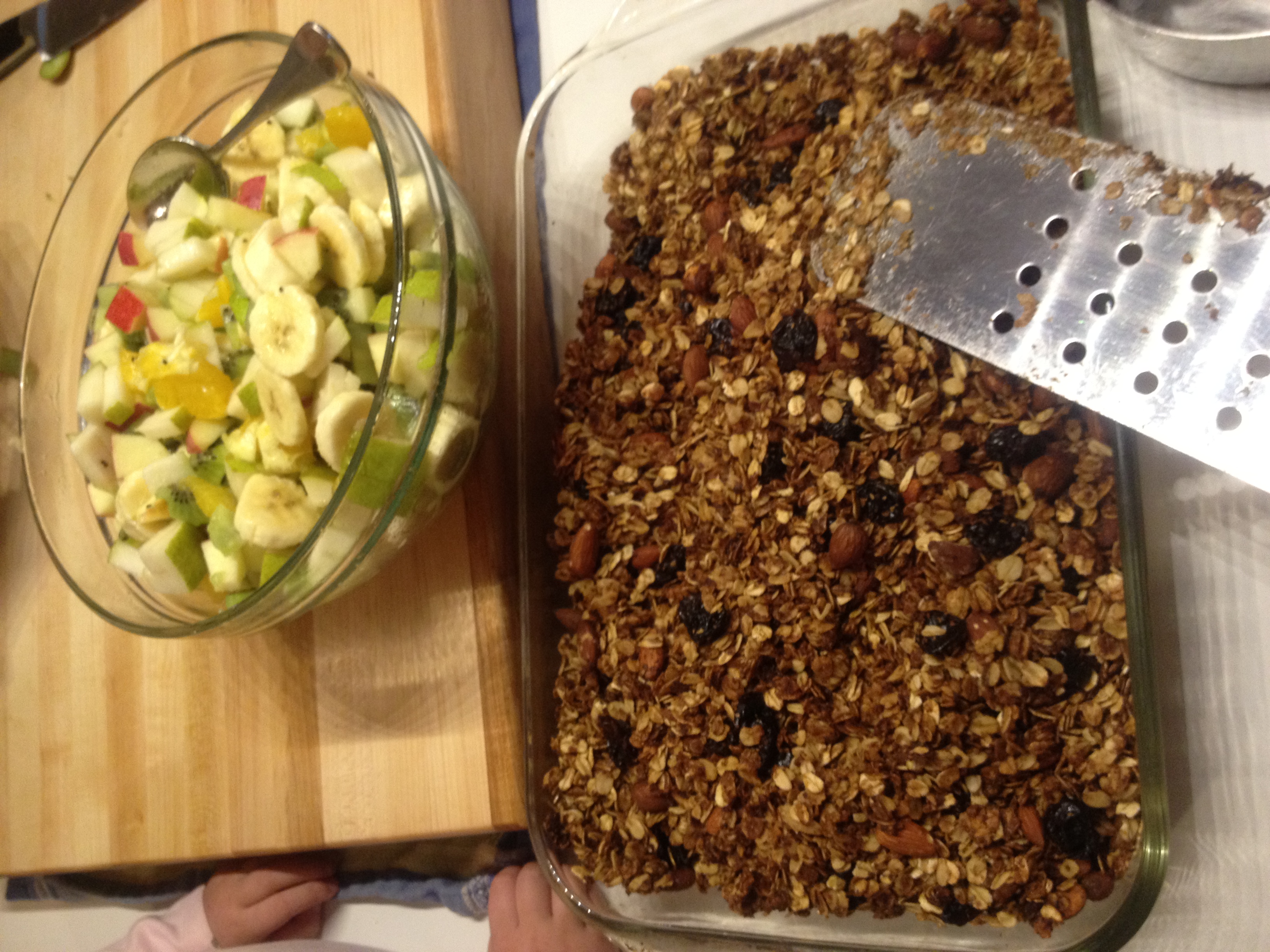 We served a make-your-own yogurt parfait bar this morning when friends came to breakfast with their kiddos: just-baked Cherry Almond Granola, yogurt and milk, fruit salad, honey and jam. With strong french press coffee with cinnamon mixed into the coffee grounds–why didn’t anyone tell me about that trick before this week? Delicious. I am going to try cardamom next.
