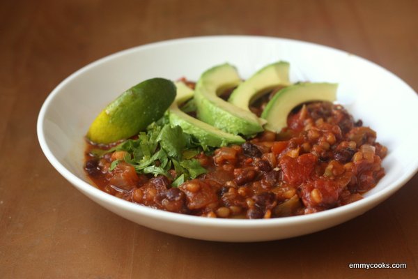 To make this Winter Vegetarian Chili, start by cooking about a cup of wheat berries in water to cover by an inch and a teaspoon of salt. (Cooked wheat berries freeze well, though, so why not make more while you’re at it?) Bring them to a boil and simmer for about an hour, until pleasantly chewy. Meanwhile, get your chili going: saute a chopped onion with a chopped red pepper for a few minutes, then add 5 minced cloves of garlic, 1 tsp. oregano and 2 tsp. each of chili powder and cumin. Once the spices start to get toasty, stir in 1-2 tsp. of pureed chipotles until fragrant (I buy canned chipotles in adobo and puree the whole can with the adobo sauce; the puree keeps in the fridge forever, as far as I can tell). Then add a big can of chopped tomatoes, 3-4 c. of cooked or canned black beans (with some of their liquid, if you cooked them yourself), some of the liquid from the cooked wheat berries, a Tbsp. of brown sugar and salt and pepper to taste. Simmer for a while and then add your drained cooked wheat berries and cook for a few minutes longer. Squeeze in a whole lime at the end. I first found this recipe in Eating Well, which basically means it’s health food. But don’t let that stop you from topping your bowl with some grated cheese and sour cream in addition to avocado, a lime wedge and cilantro. And you can never go wrong with a chunk of corn bread.