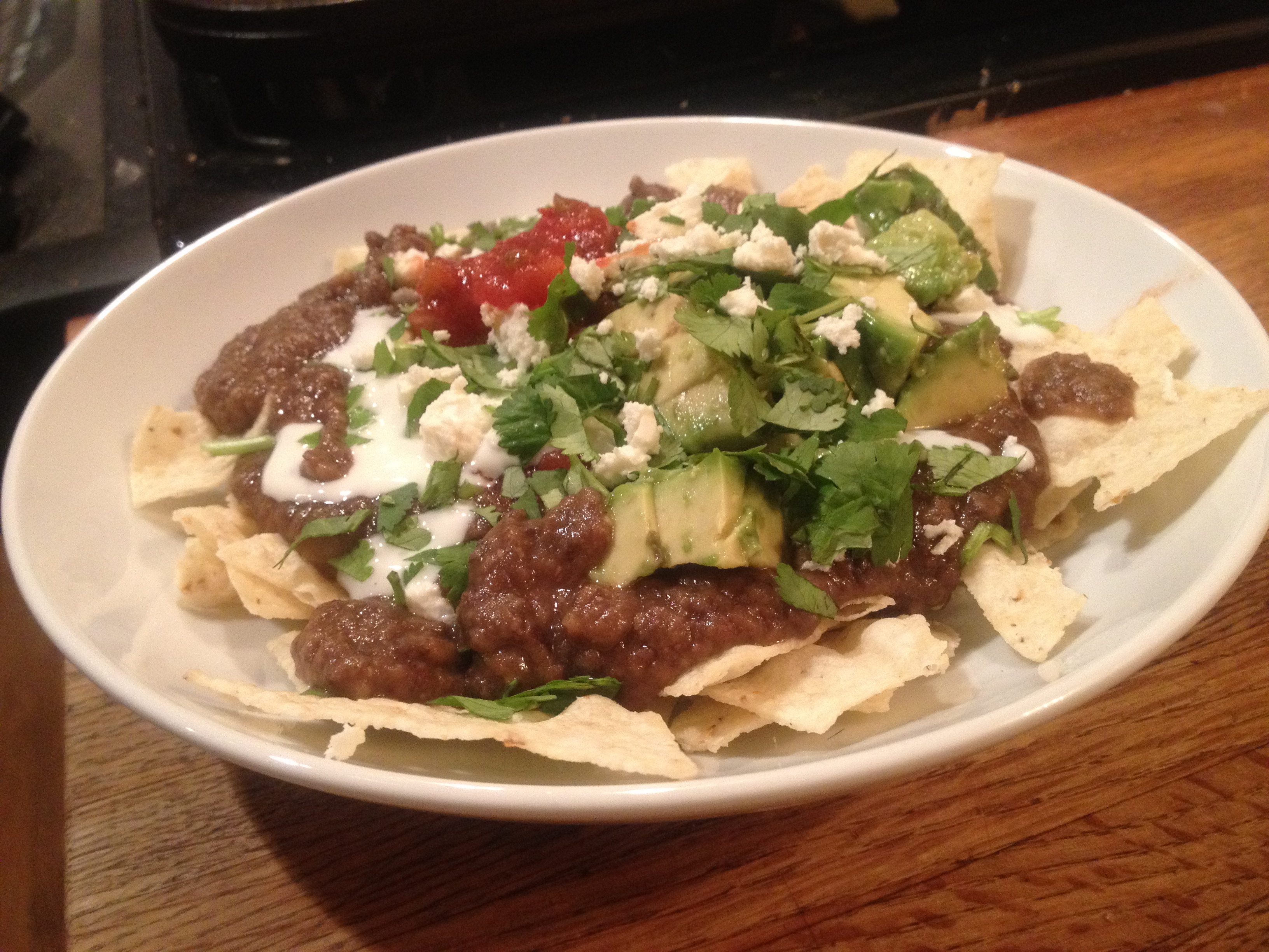 The backbone of this Chilaquiles recipe is your pot of beans. Chop a big onion and brown it in a pot over medium-high heat. When the onion gets a few shades past golden brown, mix in 5 minced garlic cloves and 1-2 tsp. chipotle puree. Notice that your kitchen is starting to smell great. Add 4 cups cooked or canned black beans (if you cooked the beans yourself, add the liquid. If they’re canned, drain and rinse them). Add enough additional water to nearly cover the beans. Add 1/2 to 1 1/2 tsp. salt (depending on whether the the beans are already salted) and simmer for about 20 mins to blend the flavors. Puree with an immersion blender and add more salt to taste. Serve with tortilla chips and assorted toppings: salsas, mexican crema (or sour cream thinned with milk), diced avocado, lime wedges, queso fresco or feta cheese and chopped cilantro. The photo above also shows a bowl of pickled onions and hot peppers I had left over from making fish tacos. Everyone grabs a bowl, adds a handful of chips and a ladle of beans, then toppings to taste. Buen provecho!