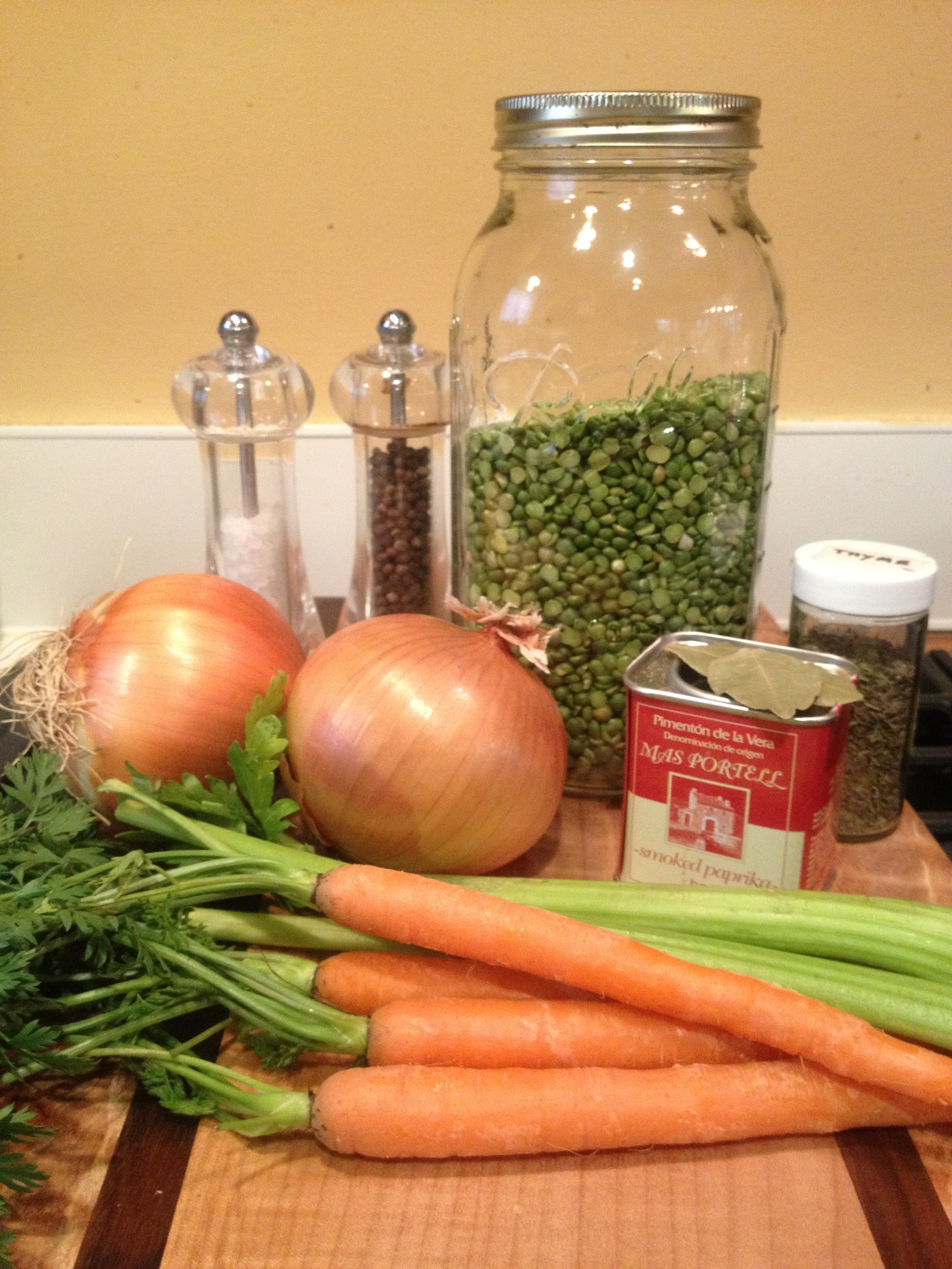 To make a regular-big (not truly huge) pot of Vegetarian Split Pea Soup, dice a large onion, a large carrot and a celery stalk and saute in olive oil until the vegetables soften and the onion is translucent.  Add 1/4 tsp. dried thyme and 1/2 tsp. smoked paprika and stir, then add 2 c. sorted and rinsed green split peas, 8 c. water, a bay leaf and 1 1/2 tsp. salt.  Maintain a peppy boil for 20 mins, then reduce heat and simmer until the split peas are very soft, probably about an hour in all, stirring occasionally.  Season with salt and pepper.  I originally planned to puree the soup, but once I cooked the peas down to mush I loved that texture too.   It tastes great both ways, but I think the pureed version looks a little more elegant.