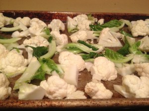 Roasted Cauliflower: Chop one head of cauliflower (or two, if you want one left to put on the table with dinner) into medium florets, and chop the remaining stem into slightly smaller pieces.  If the leaves are large, chop them as well, otherwise leave them whole.  Pile onto a roasting pan, including the tiny bits–these will brown into delicious little salty bites.  Toss with olive oil and salt and roast at 450.  Turn with a tongs after 20 minutes, then every 10 minutes after that, until they are nice and brown on all sides (about 45 minutes total).  Hide from passers-by until serving.