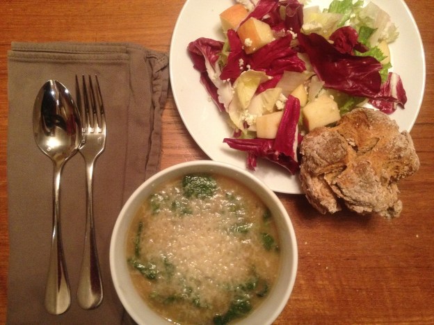 Do you cook your own beansMake your own broth?  I do, because I find the homemade versions of these things so much better and SO much cheaper than anything I can buy.  This might seem inconsistent with my professed inability to plan ahead, but I just do it every once in a while when I will be home on a Sunday afternoon: put a huge pot of beans on the stove or make eight quarts of stock.  It helps that I have a large freezer to store these things in.  What do you people do in Manhattan?  Anyway, I will start sharing recipes for some of the pantry basics that make it easier for me to get a good meal on the table quickly.  Another day.Today, White Bean and Spinach Soup: Grab a quart of good vegetable broth and a few cups of well-seasoned white beans from your freezer.  Warm the beans in a soup pot with a cup or so of broth while you saute an onion over high heat in a separate pan.  Once the onion is nearly golden and nearly caramelized, use a slotted spoon to scoop about half your beans into a blender and puree them with the onion and another cup of broth.  Add the puree to your soup pot and stir in a big bunch of chopped spinach (chard, kale, or other greens would also be great).  Simmer until the greens are tender, then thin the soup to your desired consistency with additional broth and season to taste with salt and pepper.  Serve under a shower of Parmesan shavings or a drizzle of olive oil, with crusty rolls on the side.  (The one pictured is a mini whole wheat soda bread, recipe to come after a little more experimentation.)  And what’s that gorgeous salad, you ask?  Radicchio? Endive? Apples? Blue cheese?  Oh, yes.  Hop on over to the lovely blog Salt On the Table for the full recipe.