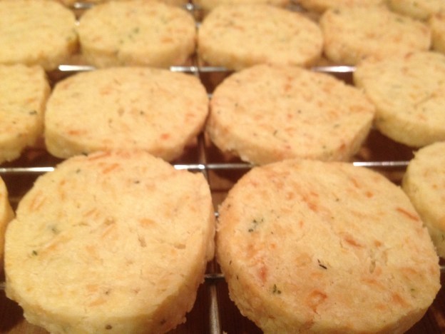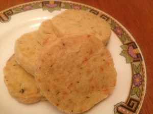 These crackers, really a savory shortbread, are perfect cocktail hour fare.  I’ve also made my grandpa those rye crackers, of course.  This recipe is Ina Garten’s.  You need to allow at least 30 minutes to chill the log of dough, or you can make the dough ahead of time, freeze it for a month or two and then just let it defrost slightly before slicing and baking.Parmesan and Black Pepper Crackers: Start by softening a stick of butter in your mixer.  Add 3/4 c. grated Parmesan, 1 1/4 c. flour, 1 tsp. fresh thyme leaves, 1/4 tsp. kosher salt, and 1/2 tsp. freshly ground black pepper.  Mix again.  If the dough is too dry (if it doesn’t form crumbs when pinched together), mix in a few spoonfuls of water or milk.  Turn the dough out onto a piece of plastic wrap, shape into a 13″ log, wrap well and freeze for 30 minutes.  Slice about 1/4″ thick and bake on an ungreased cookie sheet at 350 for 20-25 minutes, until the crackers begin to turn golden brown.  Cool completely on a wire rack.  Serve at happy hour.