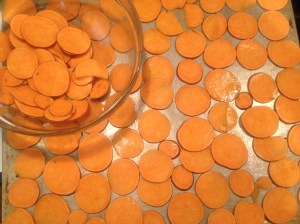 You want chips without a deep fryer?  THIS is the recipe for you.  We do this with regular potato slices as well (I keep promising that potato chip pizza recipe), but for eating on their own these sweet potato chips are the best.  They crisp up right through, you can make two big trays at a time in the oven, and they are a sweet and salty side or snack.  Crunch, crunch, crunch.Baked Sweet Potato Chips: Slice as many sweet potatoes as you want into 2mm slices.  Toss and rub well with a drizzle of olive oil and a good sprinkle of salt.  Spread in a single layer on one or more cookie sheets.  Bake at 450 until crisp, checking frequently after the first 10 minutes, and rotating pans top to bottom if you have more than one.  Remove chips as they crisp up and return the rest to the oven to continue baking (you may learn where the hot spots are in your oven!).