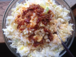 Eggs and Rice with Harissa: Saute a few green onions in olive oil, then add a scoop of cold cooked rice with a little bit of water to keep it from sticking as it warms. Scramble an egg or two and stir the egg into the rice over medium-low heat, seasoning well with salt and pepper. As soon as the egg is cooked to your liking, move to a bowl and top with a good spoonful of lemony harissa oil. (To make the harissa oil, pound a clove of garlic to a paste with 1/4 tsp. salt, then stir in 2 Tb. lemon juice, 2 Tb. olive oil, and 2 Tb. harissa.)