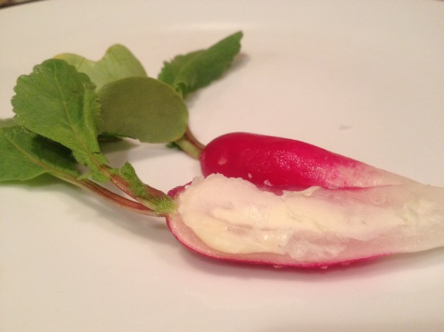 Radishes are one of those vegetable I never liked, but haven’t gotten the urge to defeat that yet. Last year I went on a beet campaign and finally defeated that dislike (beets are fabulous pickled raw, or roasted with garlic). Maybe it is time for radishes. After all, everything is better with butter.