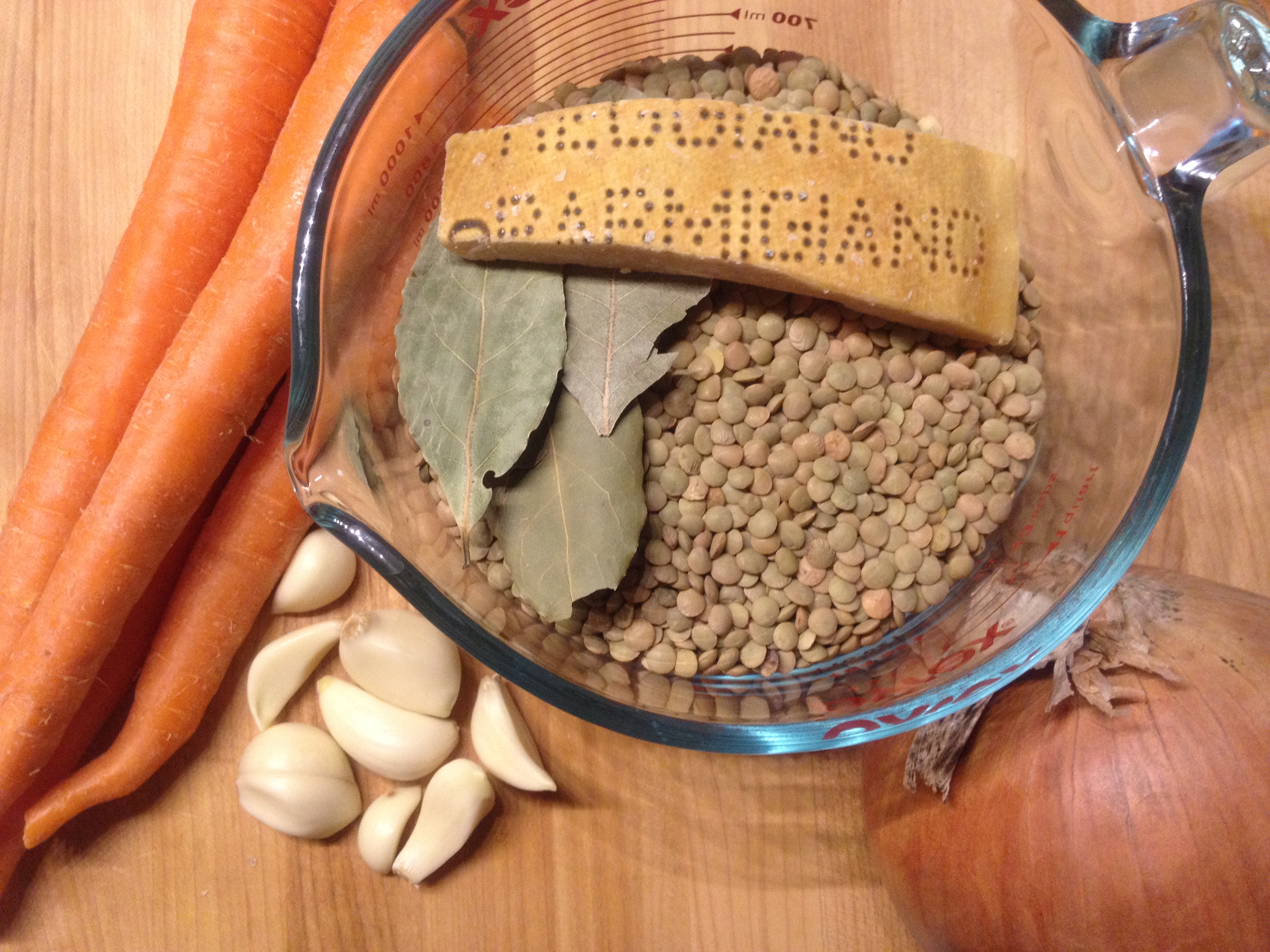 I love lentil soups. Whole Foods sells Parmesan rinds next to the pre-grated cheese. I’ve never bought them because I have more than enough at home in my freezer. I seem to accumulate more rinds than I can use up though, so the bag is a little bit like an archeological dig: really freezer-burned ones on the bottom, fresher ones on the top!