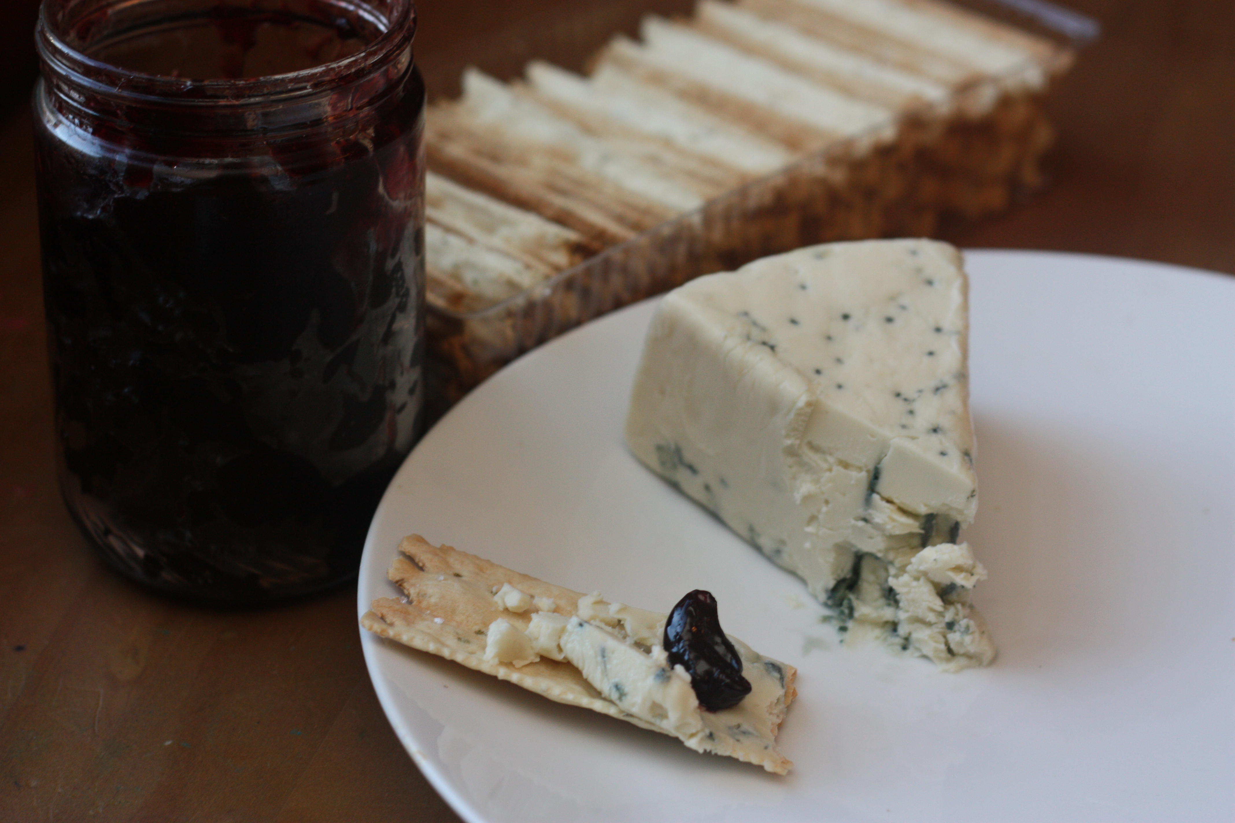 Blue Cheese and Crackers with Candied Cherry Preserves: Wash and pit 2 lbs. cherries (about 4 c.) and put them in a heavy-bottomed pot with 1 c. sugar. Bring to a simmer then reduce the heat to low and allow it to simmer for about an hour, stirring frequently (and even more frequently as the mixture becomes thicker). Make sure to scrape the bottom of the pot well each time you stir so that nothing sticks and burns. When the cherries are cooked into a thick sauce, add the juice of half a lemon and taste, adding more sugar or lemon to taste. You can puree the mixture into a cherry butter at this point, or leave the preserves chunky as I did. Scrape into a jar and store in the fridge for up to two weeks. Serve on crackers with blue cheese or chevre, or anywhere else a dramatic preserve would be welcome.