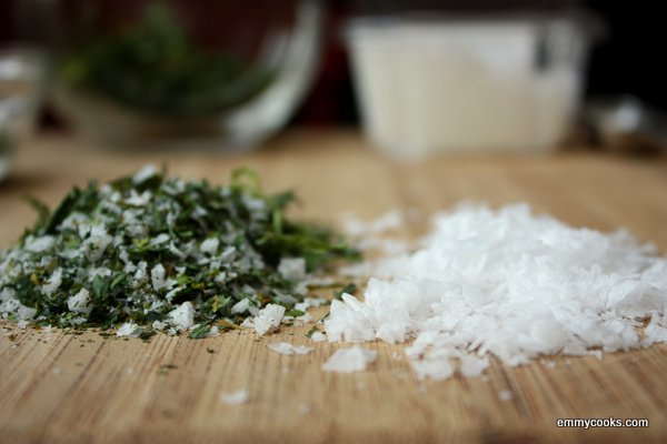 Homemade Celery Salt (adapted from 101 Cookbooks):  Pluck the leaves from a bunch of celery.  Rinse them and dry them thoroughly.  Spread in a single layer on a baking sheet (or two, if necessary) and bake at 350 for 5-7 closely-watched minutes, until the leaves are crisp but not browned.  Cool, then crumble (discarding any leaves that aren’t completely dried, which won’t crumble) and mix with an equal amount of flaky salt.  Store in an airtight container.