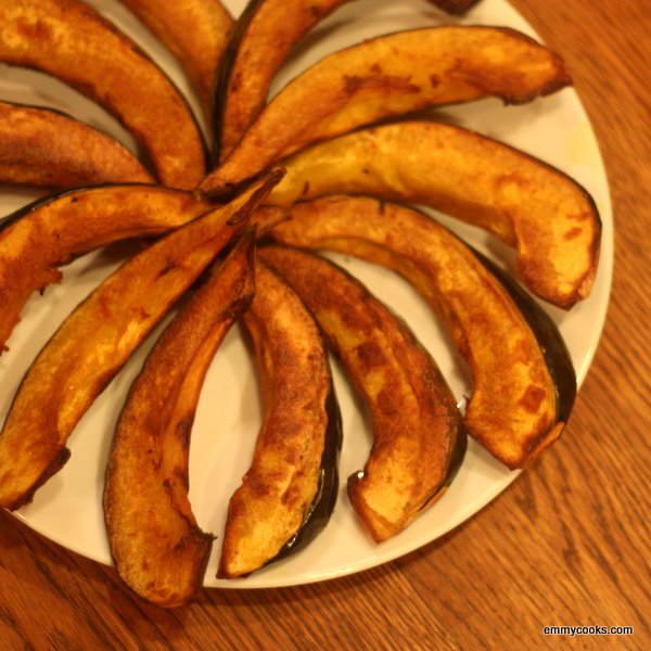 Roasting unpeeled winter squash also makes for a striking presentation.  That’s a pie pumpkin above and a hefty acorn squash pictured above, but you can use this technique with any squash that you can manage to hack apart.  I especially appreciate this approach when I’m dealing with a ribbed or bumpy squash that would be a serious hassle to peel uncooked.  (Alternatively, just stick to squash with edible peels and you avoid the trouble altogether.)Roasted Winter Squash Wedges: Halve each squash (watch your fingers!) and scoop out the seeds.  Slice each half into wedges that are 1 1/2″ to 2″ wide at the widest part (watch your fingers!).  Rub with olive oil and a sprinkling of salt.  Arrange on a baking tray so every piece is touching the pan and bake at 400 until the first side is golden (start checking after 15 minutes).  Turn the squash to the second side and repeat.  Bake until both sides are golden brown and the squash is tender when pierced with a knife.