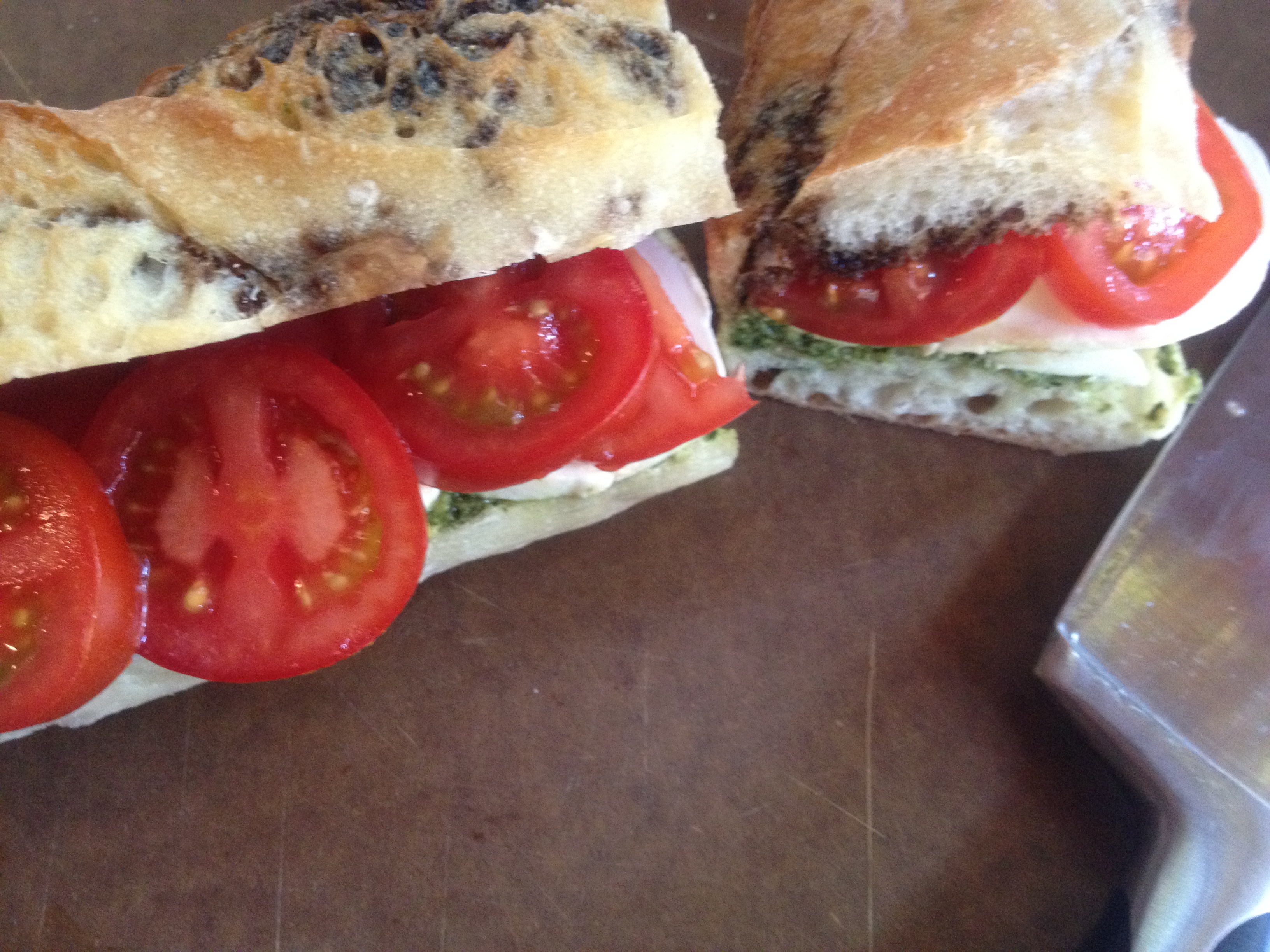The order of assembly is important here: pesto on the bottom half of the bread, please, and vinegar on the top, so that the vinegar soaks down into the tomatoes, which should be on top of the cheese, which collaborates with the pesto to keep the bottom piece of bread from getting soggy.  Got that?  Top to bottom inside your baguette: balsamic vinegar, tomato, fresh mozzarella, good basil pesto.  Yes, I spend time thinking about these kinds of things.  I can admit it here because I know that you do, too.  That’s why I’m glad we’re friends.