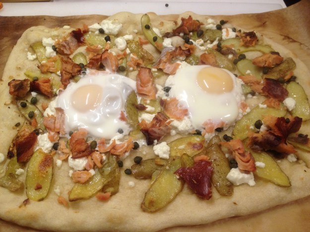 Left with only a handful of potatoes, it was back to the fridge, and this Sunny Side Up Pizza was born. Crank your oven as hot as it goes and put in a pizza stone if you have one. Layer your thin pizza crust (recipe here if you want one) with thinly-sliced potatoes (first roasted at 425 until just beginning to crisp) and a sprinkling of mozzarella. Pile on chunks of goat cheese and a big handful of rinsed capers. We crumbled on some smoked salmon, but you could skip that step and just go with a big sprinkle of salt over the whole pizza if you prefer. Finally, we broke two eggs over the pizza, but they were so good that we later wished we’d used four. Getting the eggs perfect will depend on your oven temperature and how thin you stretched your crust (because that has to cook through, too), so you might need to experiment a little. Baked in our oven at 550 for almost 6 minutes, the whites were set and the yolks were lusciously runny, perfect for wiping up with the last piece of pizza crust.