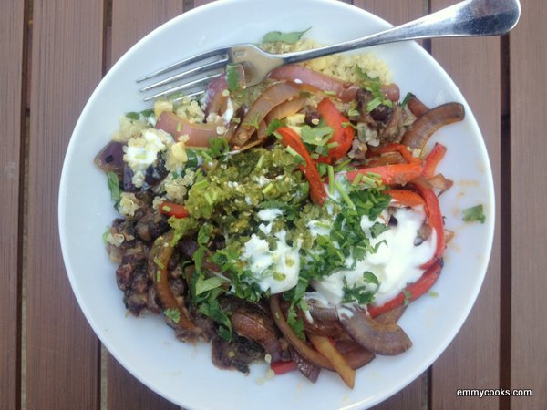 Menu 1: I filled my 7-quart crockpot with a batch of black beans and froze most of them. A few cups went into a pot of seasoned black beans, which we ate with quinoa with corn and green onions (no feta this time), tomatillo salsa, and corn tortillas. Today I had leftovers for lunch with a pile of nearly-charred red peppers and onions; tomorrow we’ll finish the beans off as huevos rancheros. The leftover quinoa is destined for greens-stuffed quinoa cakes.