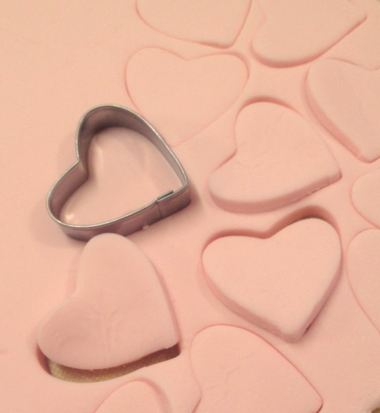 Roll the dough out 1/8-1/4 inch thick. Use heart -shaped cutters (I used a set of fondant cutters) to make tiny or almost-tiny hearts. (Smaller = more realistic. Bigger = easier to write on.) Pinch the scraps back together and re-roll. The original recipe said it would make 100 hearts, but it actually made a gazillion. Really. More than 500.