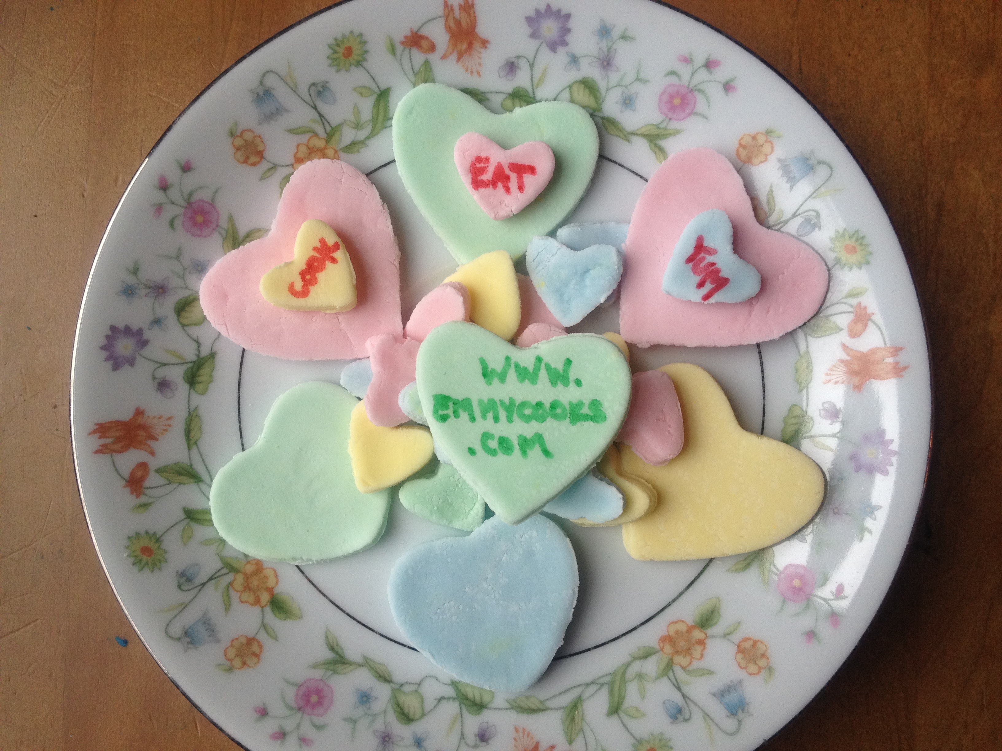 Easy peasy. Enter homemade conversation hearts. I have quite a fondness for the CakeSpy cookbook Sweet Treats for a Sugar-Filled Life, which inspired this wacky project. And it was easier than I thought it would be.