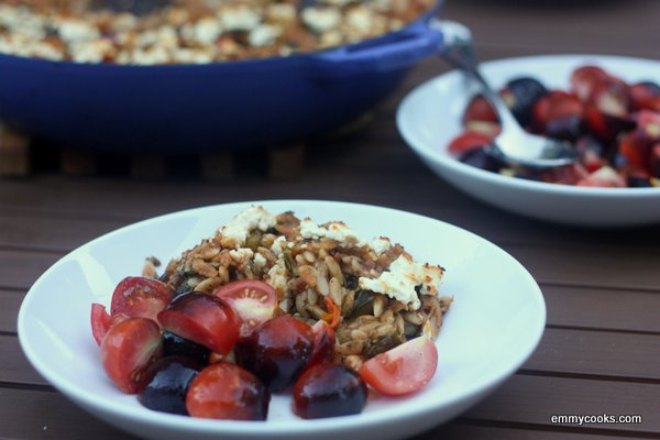 The lazy cook in me was intrigued by the baked pasta recipe that appeared on Smitten Kitchen today.  Because the pasta it used was orzo and (why did I never think of this before?) the orzo can be baked without pre-boiling, thereby saving you six minutes and the washing of an extra pot.  You’re welcome.Deb’s recipe, adapted from our favorite Yotam Ottolenghi, is for a cheesy (just-cheesy-enough, she says) bake with the usual Ottolenghian flourishes of lemon zest and oregano.  And it sounds lovely.  But once I started browning perfect summer vegetables–eggplant, zucchini, peppers, falling-apart fragrant tomatoes–I couldn’t bear to adulterate them much.  (If your tomatoes are less than perfect, by all means try out the original recipe’s suggestion to jazz them up with a few tablespoons of chopped oregano and the zest of a lemon; you could even add that chopped mozzarella.)  For me, whole wheat orzo, salt, and the heat of the oven were enough to make the pan of vegetables a hearty late-summer meal.  I crumbled feta on top at the end and browned it under the broiler, but it’s perfectly delicious without the cheese.  A tomato salad on the side provided a sweet little bite of acid to compliment the richness of the cooked vegetables.  (The Indigo Rose tomatoes were almost too pretty to eat.  Almost.) Continue reading