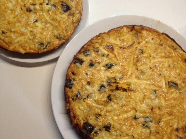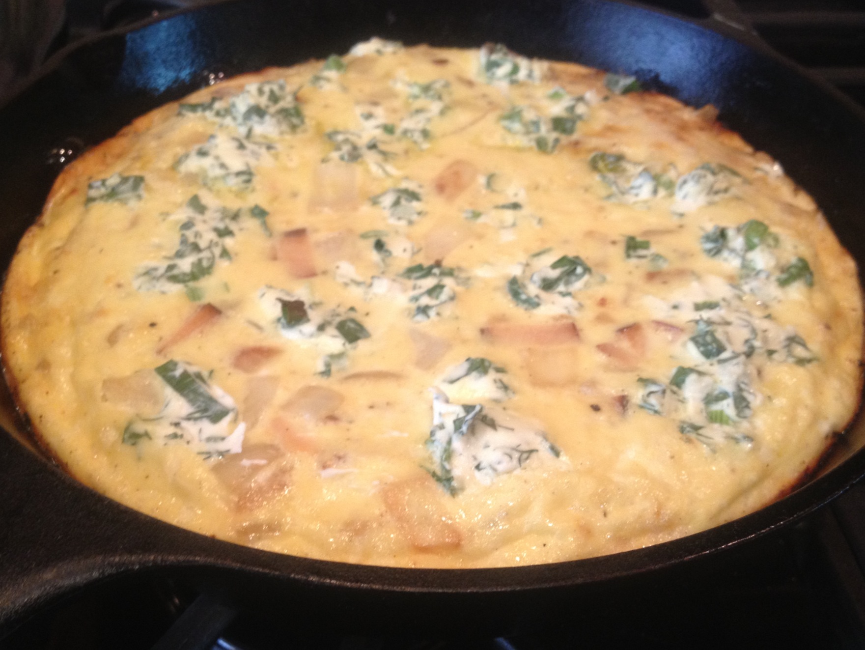 Smoked Salmon Frittata with Spinach and Herbed Cream Cheese: First make a bowl of herbed cream cheese by mashing some cream cheese with a pinch of salt and a ton of chopped herbs (I used green onions, chives, parsley, dill, oregano, and thyme, probably about 1 c. loosely packed chopped herbs for 4 oz. cream cheese). Set aside. Sauté an onion until translucent and then stir in a few big handfuls of just-washed chopped or baby spinach until the spinach wilts and any moisture evaporates. Meanwhile, beat 6 eggs with salt, pepper, and ¼ c. crème fraiche or plain yogurt. Flake a piece of smoked salmon into the eggs, then add the onion and spinach and mix well. Wipe out the pan you used for the onions, add a little olive oil, and heat the pan over medium heat. Pour in the egg mixture and cook for about 5 minutes, until the edges are set. Dollop herbed cream cheese (as much as you want) on top of the eggs. Move to the oven and bake at 375 for about 10 more minutes, until the eggs are set.
