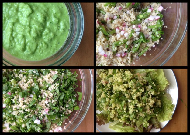 I know I once said I couldn’t tolerate a one-color meal, but it turns out that maybe I can if the color is springtime green. I wish that I had taken a picture of it all together, but you will just have to imagine how lovely the table looked with this salad alongside a bright green pea-and-basil soup and followed by an equally brilliant avocado mousse. So green!